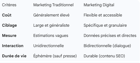 Le marketing digital englobe tout ce qui se passe sur le web : réseaux sociaux, référencement naturel (SEO), publicité payante (Google Ads), e-mailing et marketing de contenu.